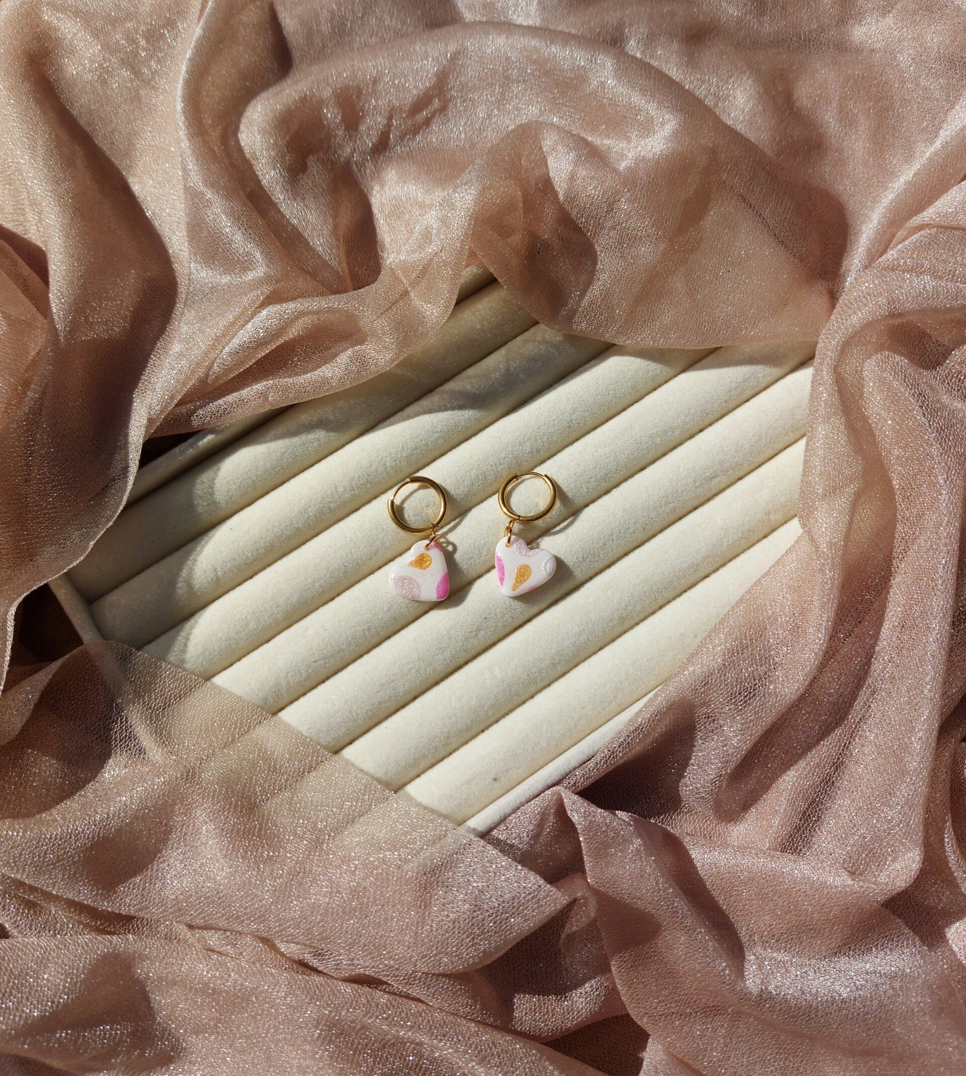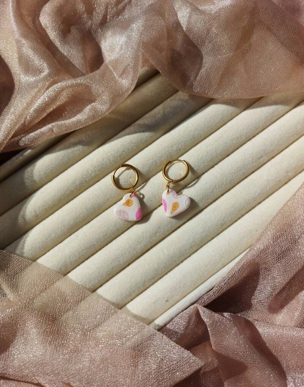 De Tessa oorbellen zijn hartvormig en dankzij het gebruik van polymeerklei licht en comfortabel om te dragen.