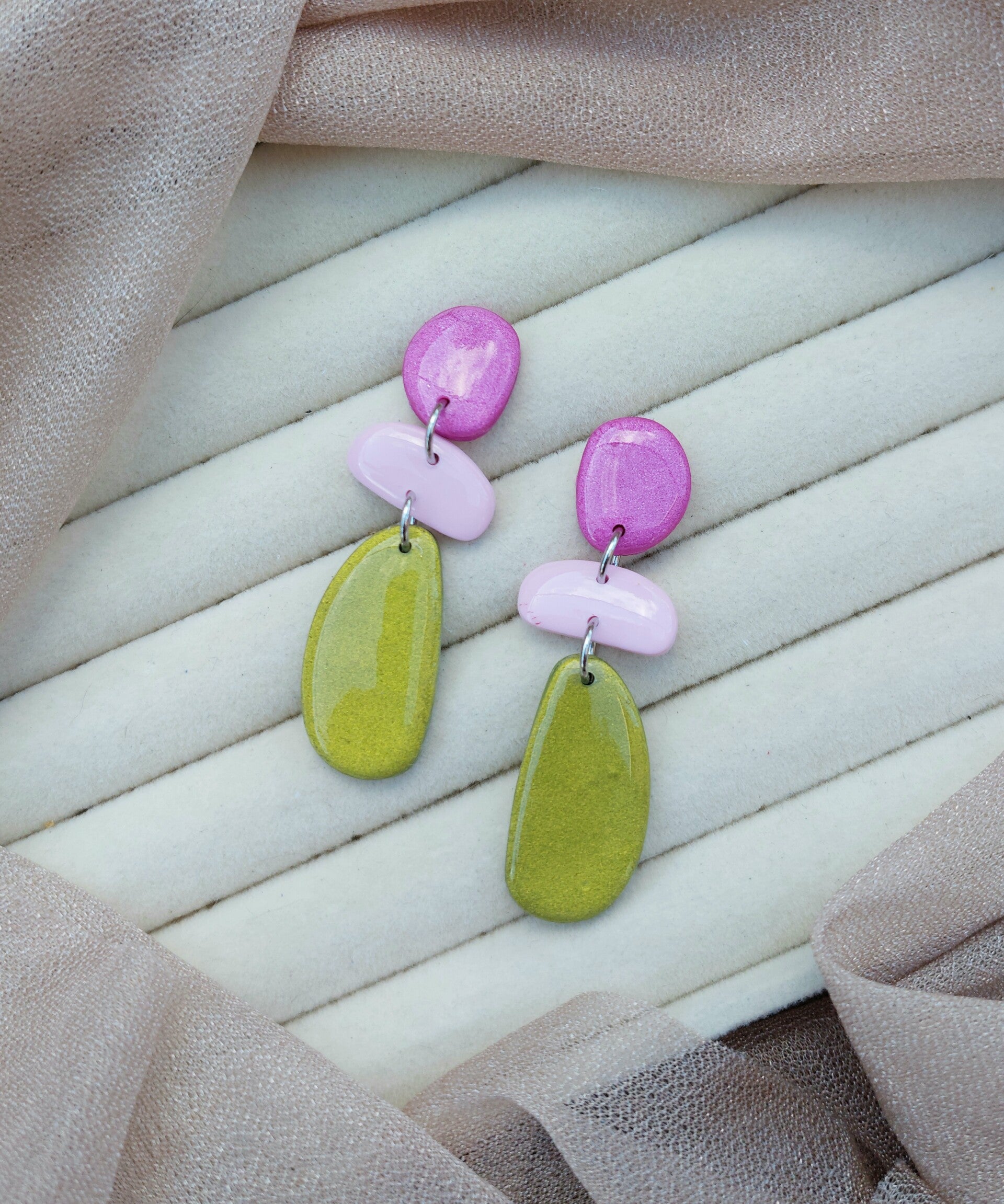 De Celeste oorbellen zijn drie-delige, handgemaakte sieraden van polymeerklei die kleur en speelsheid combineren. Elk deel is zorgvuldig vormgegeven, waardoor de oorbellen een levendig en uniek accent geven aan elke outfit. Perfect voor wie durft op te vallen met stijl.